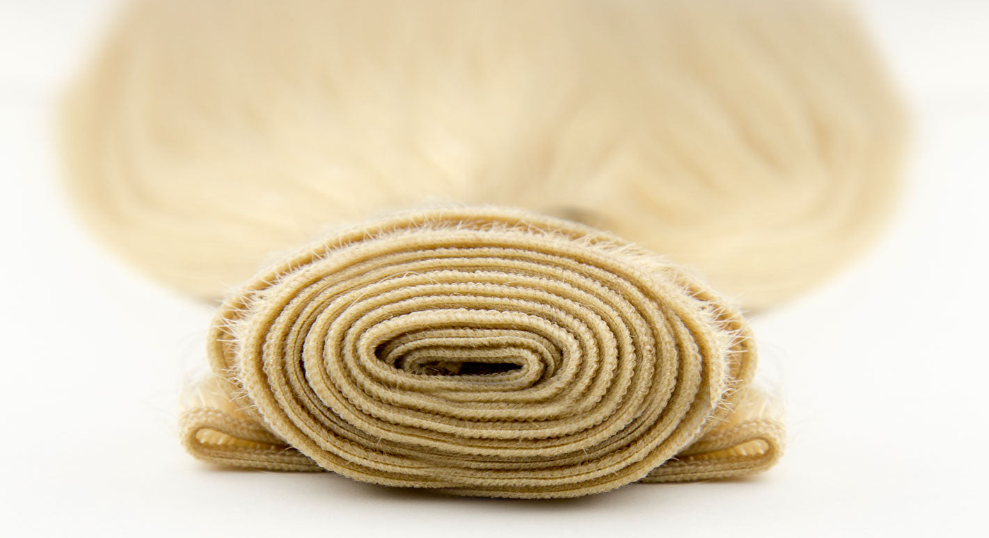 Bohyme Machine Tied Wefts are 30% thinner than the industry standard. These durable wefts are formed using bulk or loose hair that is fed through a triple-head sewing machine. Before two individual wefts are merged, hair is folded and sewn at the root, adding a reinforced stitch to ensure durability and prevent shedding. This technique also allows to creation of exceptional back-to-back color blends and forms one strong and flexible double-sided weft.